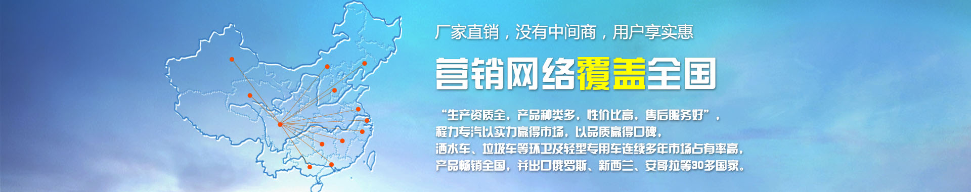 我公司致力于開(kāi)發(fā)生產(chǎn)銷(xiāo)售專(zhuān)用汽車(chē)為已任,為您量身打造方便實(shí)用,耐用的專(zhuān)用汽車(chē),其主導(dǎo)品種有園林綠化灑水車(chē)、環(huán)衛(wèi)灑水車(chē)、油罐加運(yùn)油車(chē)、吸糞車(chē)、吸污車(chē)、擺臂、掛桶、密封式垃圾車(chē)、廂式運(yùn)輸車(chē)、消防車(chē)、半掛車(chē)、自卸車(chē)、水泥車(chē)、隨車(chē)吊等八大系列100多個(gè)品種300多個(gè)車(chē)型。同時(shí)批發(fā)東風(fēng)、解放、福田等各種二類(lèi)底盤(pán)。目前我公司銷(xiāo)售網(wǎng)絡(luò)基本已覆蓋全國(guó)各地,具體如下。